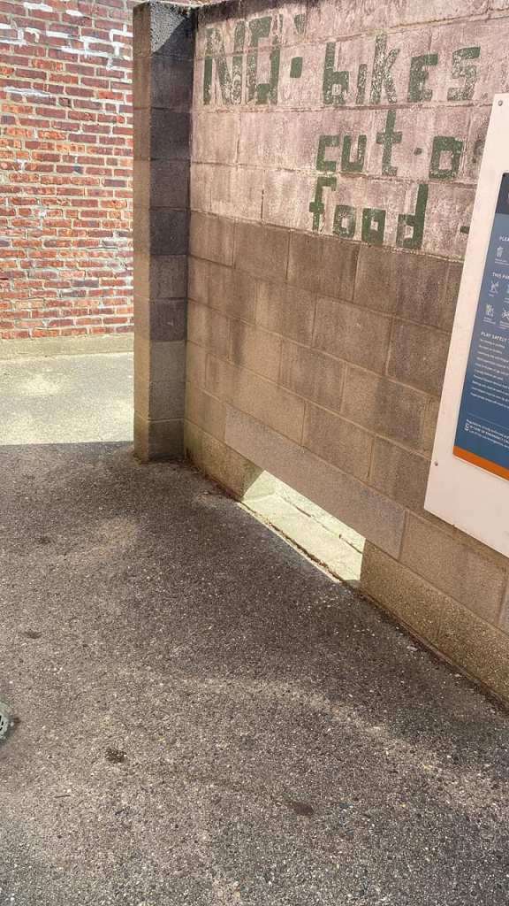 Inside this fortress, which requires stairs to enter (unless there’s a secret back door that I am not aware of), is a unique maze of accommodations. These start with a large all-genders changing area (presumably a throwback to the days when there were separate boys’ and girls’ days at the pools) with multiple benches and a wall of screws that may have at one time been a place to hang towels. This area is surrounded by a cinderblock wall that gives it a penitentiary locker room vibe except for the clear blue skies above.
