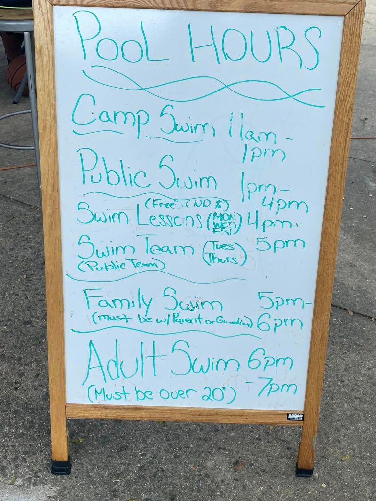 There were all ages during free swim. There was a family playing a game of Marco Polo and my partner and I mentioned to each other we had never actually played the game or understood the rules. The mother told us that it is essentially a game of hide and seek with one person, “Marco,” having eyes closed and using voice clues to seek out the people calling “Polo.” We had struck up a conversation with this mother previously because she was afraid of a dragonfly in the pool, and I sang the praises of the mosquitotarian diet of dragonflies, even though they are a little bit intense looking sometimes and I was frightened of them as a kid. The vibe was very nice.