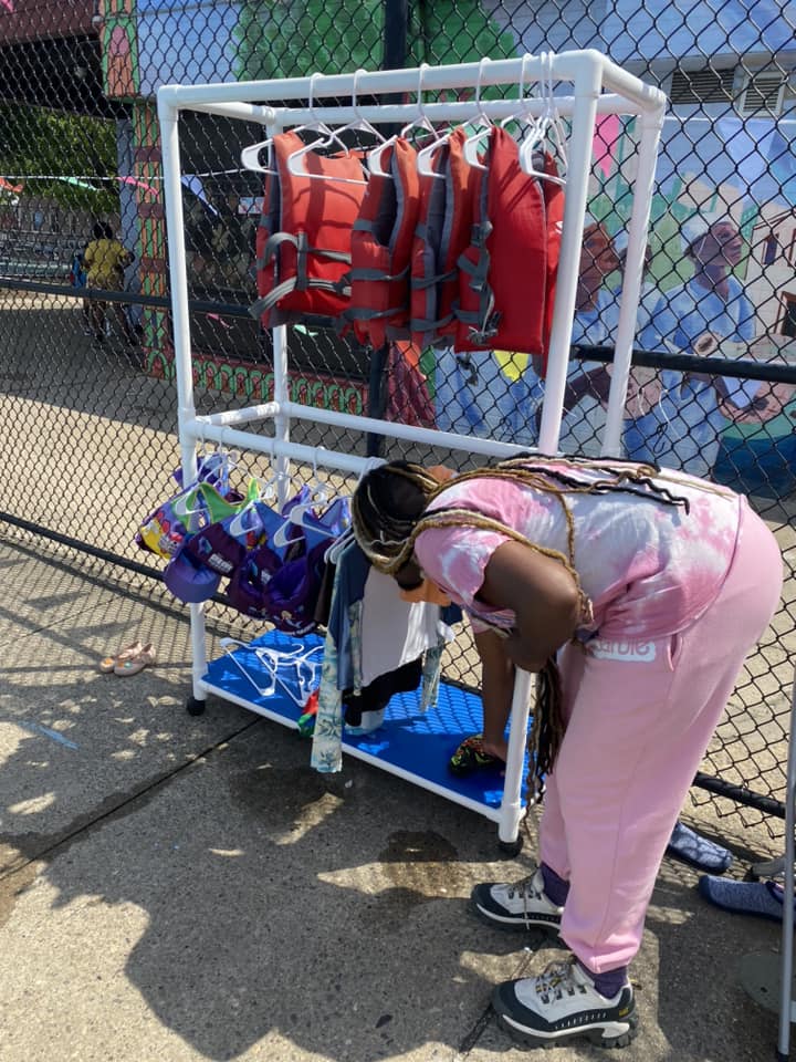 Inside the pool area, there were floatation devices to loan campers and visitors, as well as some donated swimsuits for visitors who arrive to swim without the required proper swimwear. The fabulously styled staffer in the photo indicated that many kids are in need of swimwear, and that adults tend to have proper attire when they arrive, but adult sizes are welcome for larger youth.
