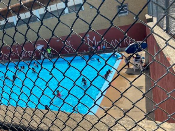 With the walls surrounding it, the pool has the illusion of privacy, although anyone in the playground above has a bird’s-eye view of the goings on inside the big rectangle with eight ladders — enjoyed by about 50 people, mostly kids, on this warm Wednesday afternoon.