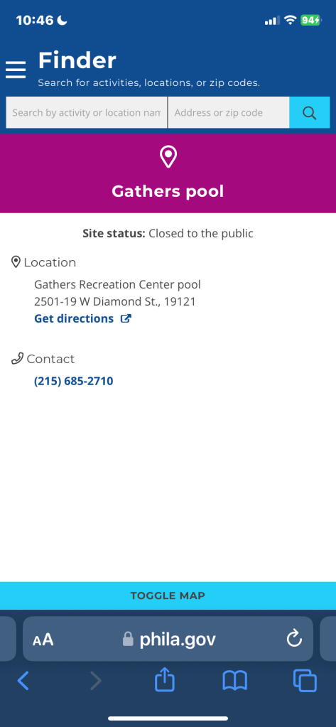 After my fun and rigorous noon workout with Nancy at Mander Playground, I made my way down Diamond Street to the other side of the tracks from Fairmount Park. This rec center is on my list as having a pool. But at first, I don’t see the pool. Or the rec center even.