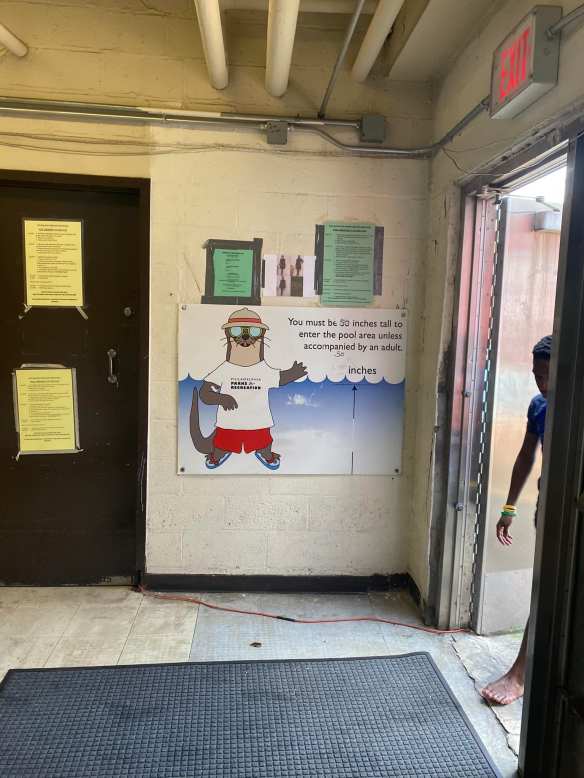 To enter the pool, a staffer taking a break directed me behind the gate and around the corner to the rec center. You enter through a gate on the 25th Street side, which brings you through a rear door of the rec center to the pool area (the gate is only accessible to staff).