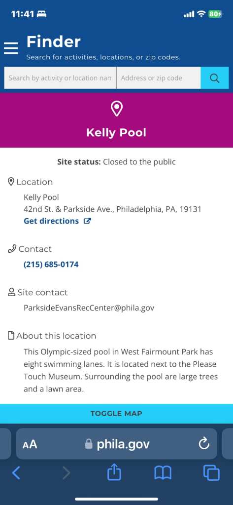 Some friends told me that Kelly Pool Fairmount Park was officially open, but the City’s website indicates that it is closed.