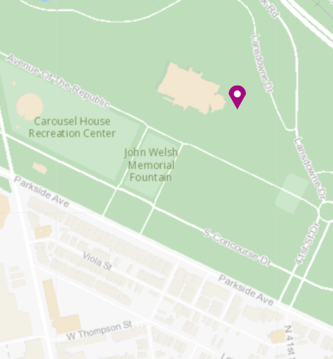 It is not on Parkside Avenue, nor is it near 42nd Street. It is off Lansdowne Drive in West Fairmount Park, tucked behind Memorial Hall / the Please Touch Museum.