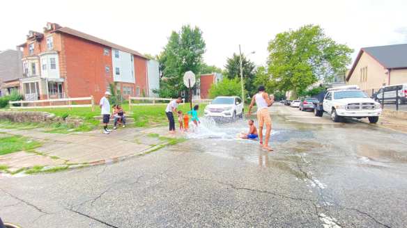 Sad that both this and F.J. Myers Pool are dry this year… Everyone from Cobbs Creek south to Kingsessing and north to Market Street has only Christy Pool to cool off — or open the hydrants, as we saw some neighborhood folks doing today. My friend got permission to take their photo so that she could use the picture for a painting.
