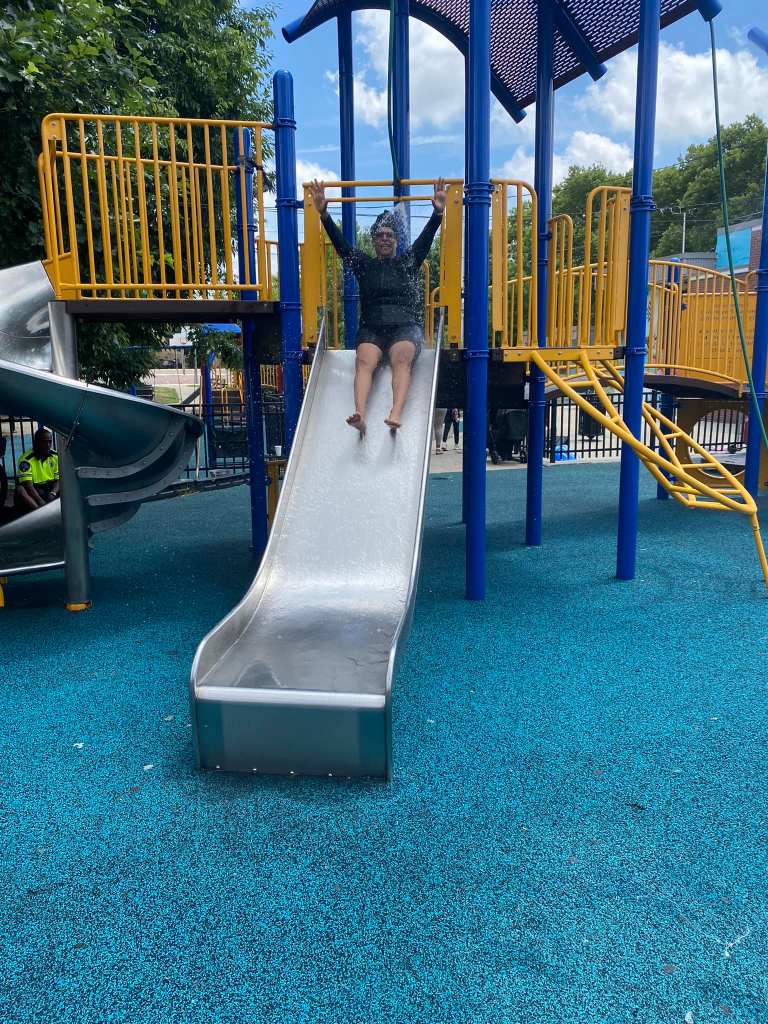 The pool did not open til 1, and we were there at five til, but the young children who were there for camp were filled with advice and invited us to go down a jerry-rigged waterslide in the playground, which does not have a splash garden, but does have a hose extending from the pool area onto a sliding board. It was pretty amazing, though we are probably a bit too old for such rides. It was fast.